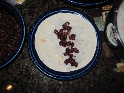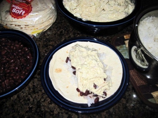 - Assemble enchiladas: Layer Tortilla, approx. 2 tablespoons rice, approx. 1 teaspoon black beans, then chicken mixture. (adjust this to your own personal tastes and preference)