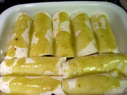 - After all of the tortillas are rolled and placed in the baking dishes, top with remaining Enchilada Sauce.