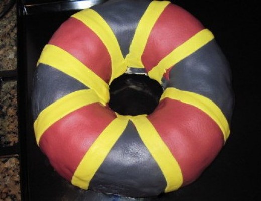 - Cut 8 Yellow Stripes and Place on Each Side of Each Red Strip and Gently Press into Place. Stripes should be cut 3/4″ wide and 8″ Long. Trim and tuck as needed around the edges of the cake.