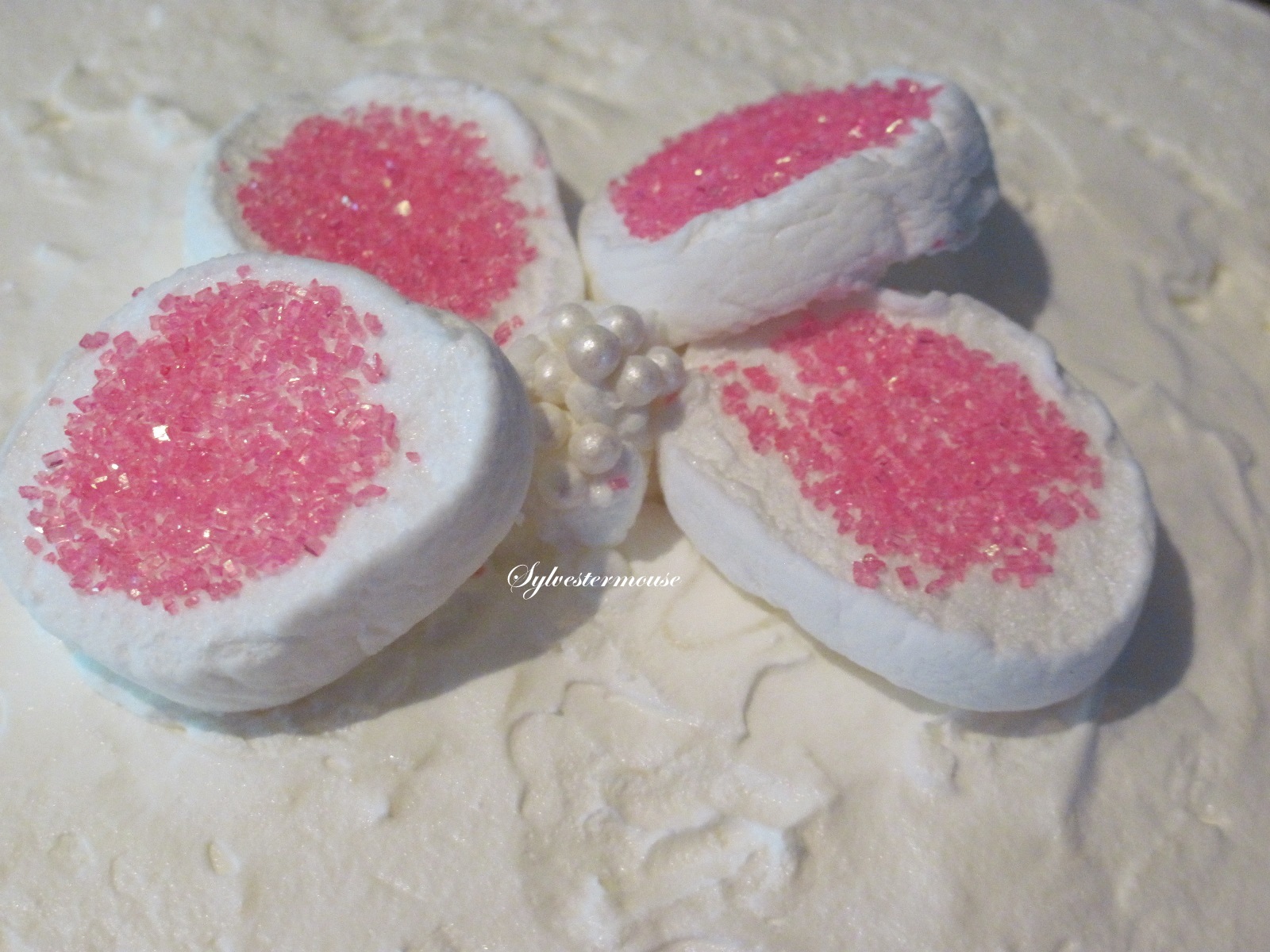 Step 8: For the center of each flower, pinch a section of a marshmallow and make a small ball (sticky side out). Place the marshmallow ball in the center of the flower and drop the Pearl Gems in place.
