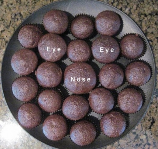 Step 1: Assemble 22 mini cupcakes in the shape of a pumpkin, placing the largest cupcakes for the eyes and nose. (as shown)