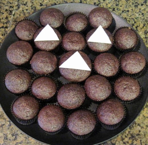 Step 3: Place a triangle on each eye cupcake and on the nose cupcake.