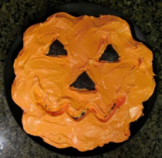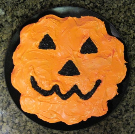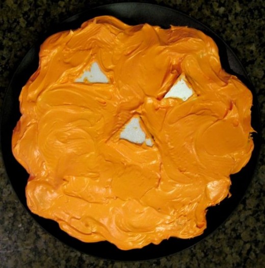 Step 8: With the edge of a butter knife or spoon, draw a mouth pattern by removing the orange frosting for mouth.