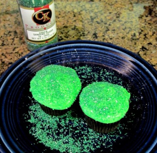 Step 12: Cover the green cupcakes with green sanding sugar and place them at the top of the pumpkin for the stem.